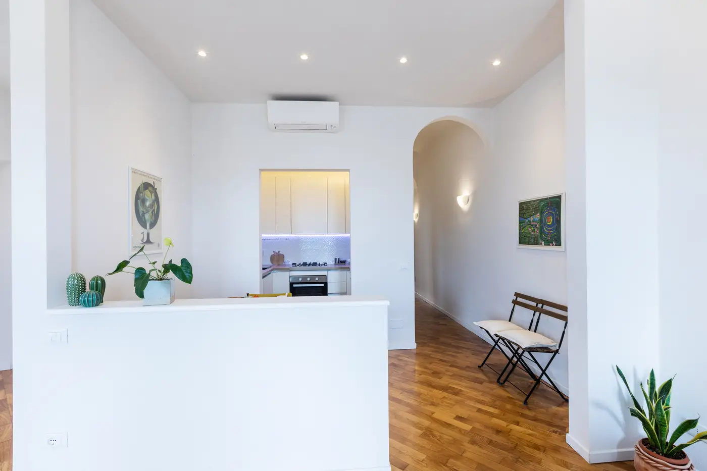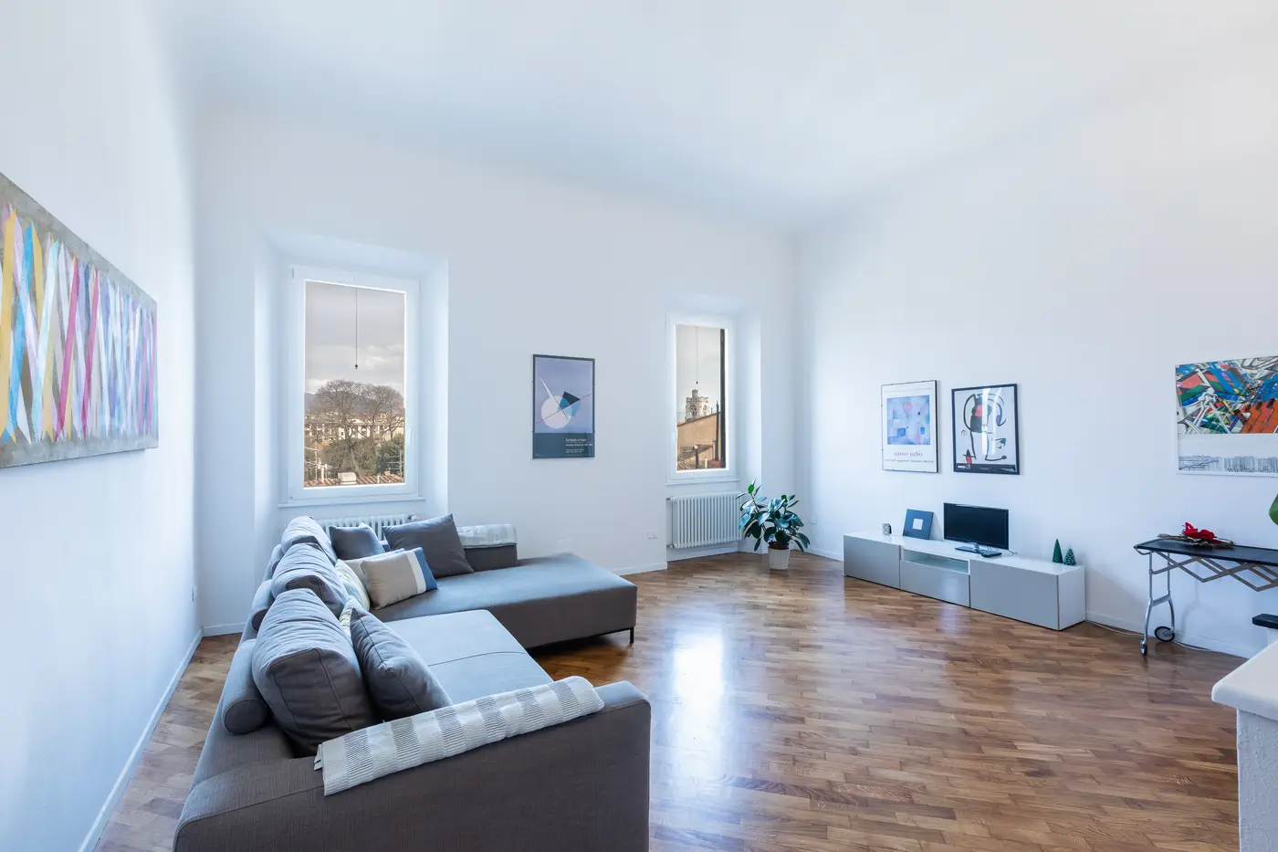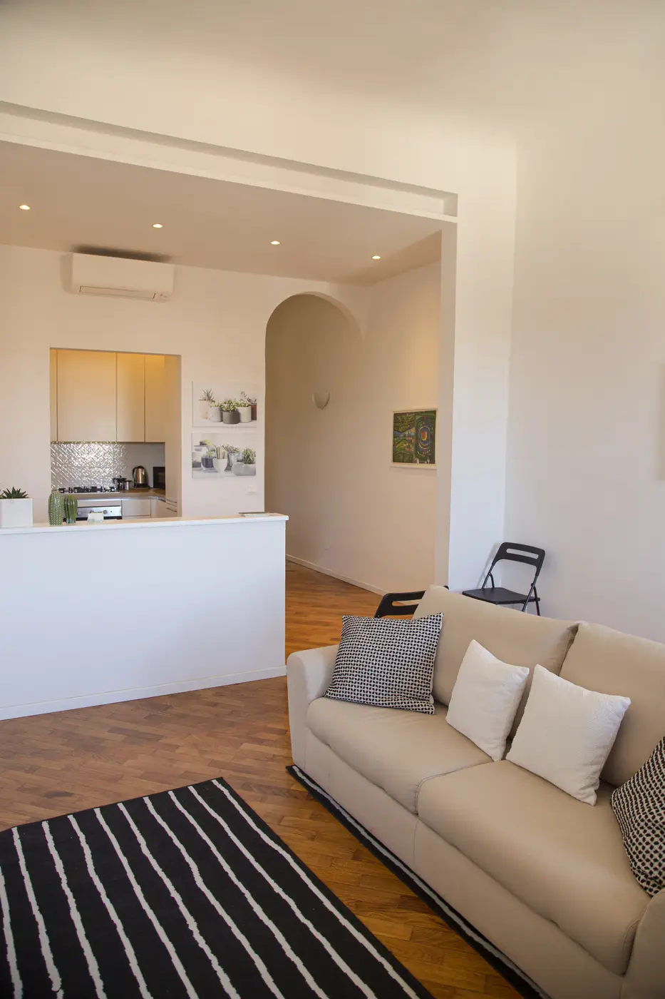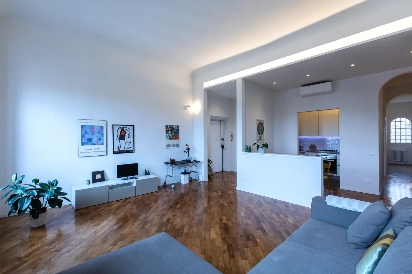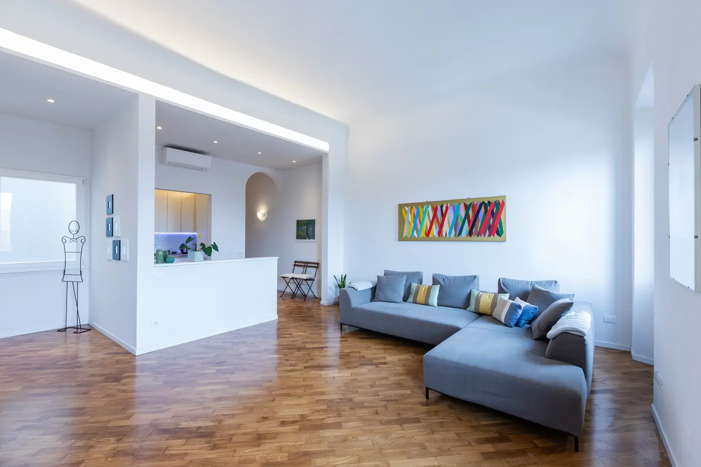 Luminoso appartamento moderno ristrutturato con materiali di pregio, alti soffitti e pavimenti in parquet, situato al quarto piano (senza ascensore). L’appartamento può ospitare comodamente famiglie o gruppi ed è composto da: