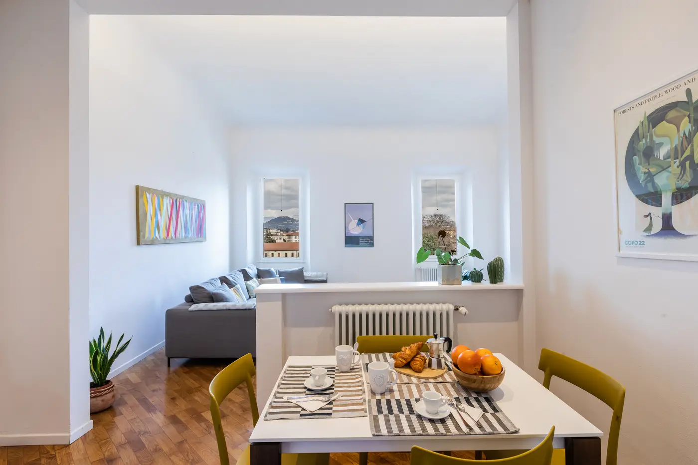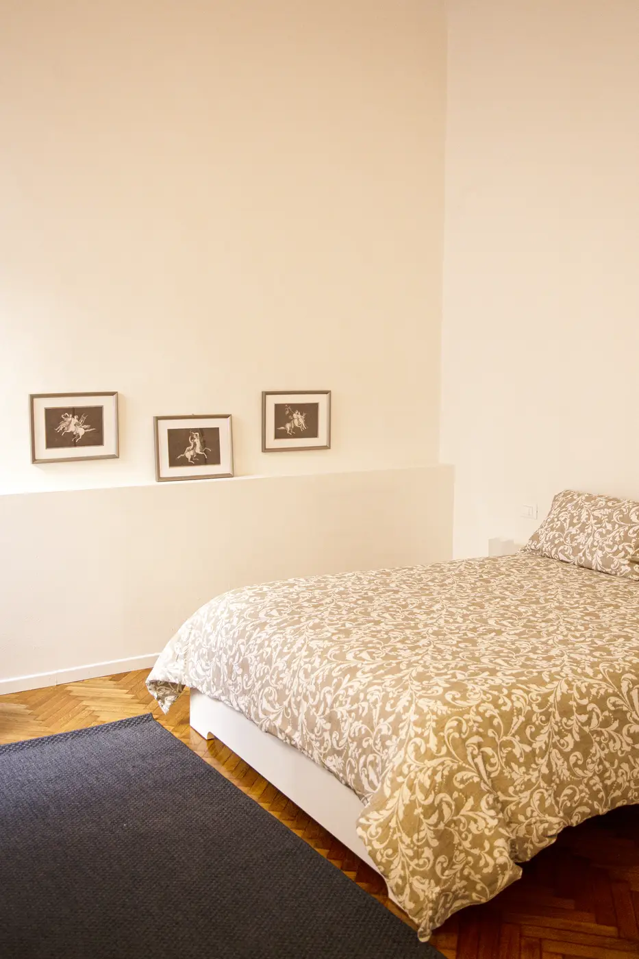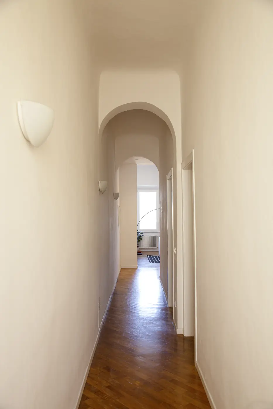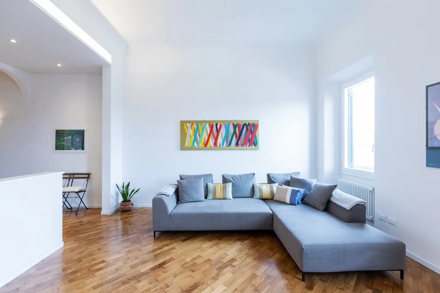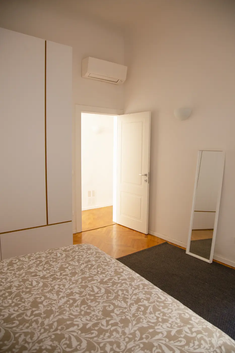 Luminoso appartamento moderno ristrutturato con materiali di pregio, alti soffitti e pavimenti in parquet, situato al quarto piano (senza ascensore). L’appartamento può ospitare comodamente famiglie o gruppi ed è composto da: