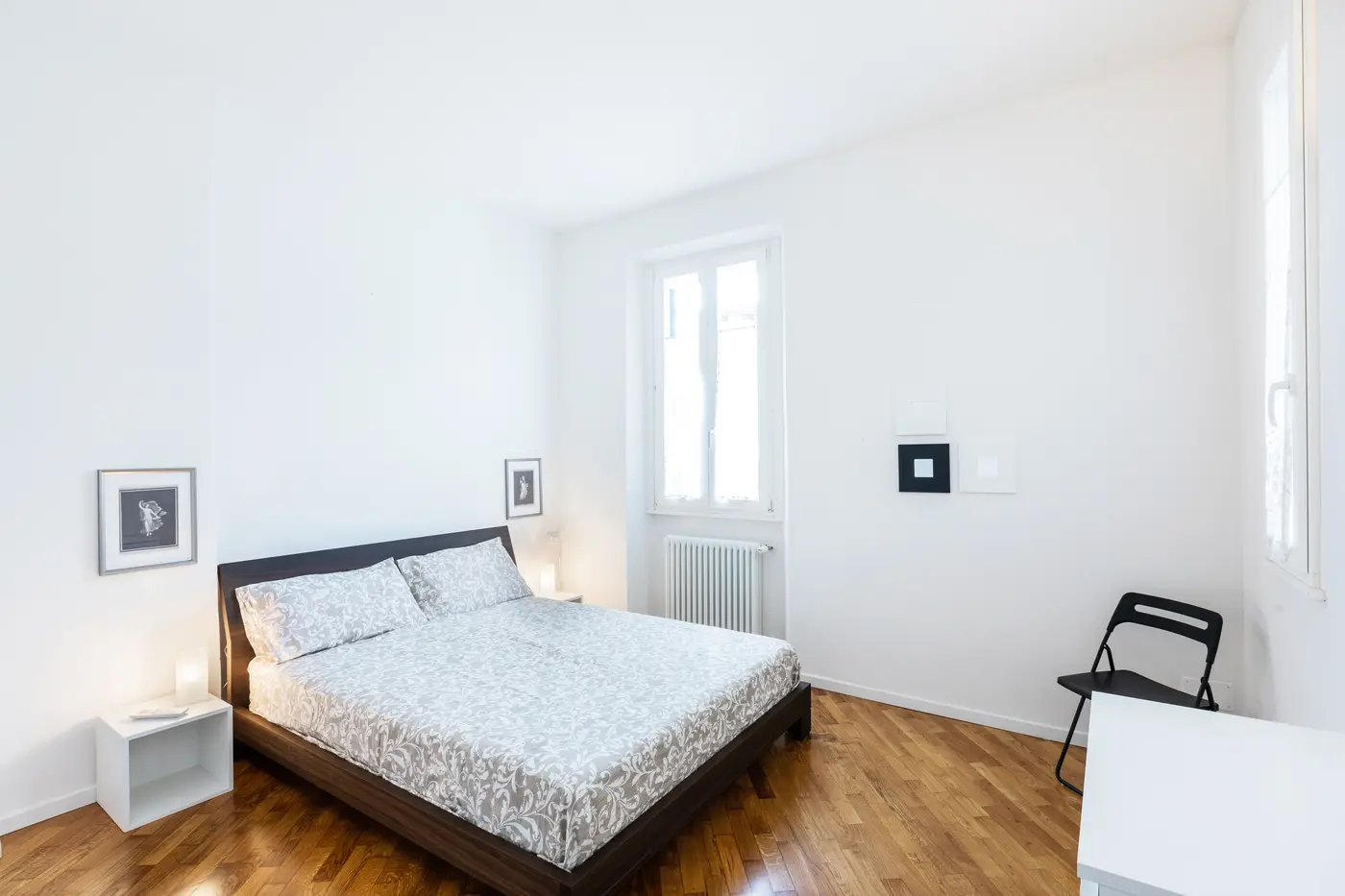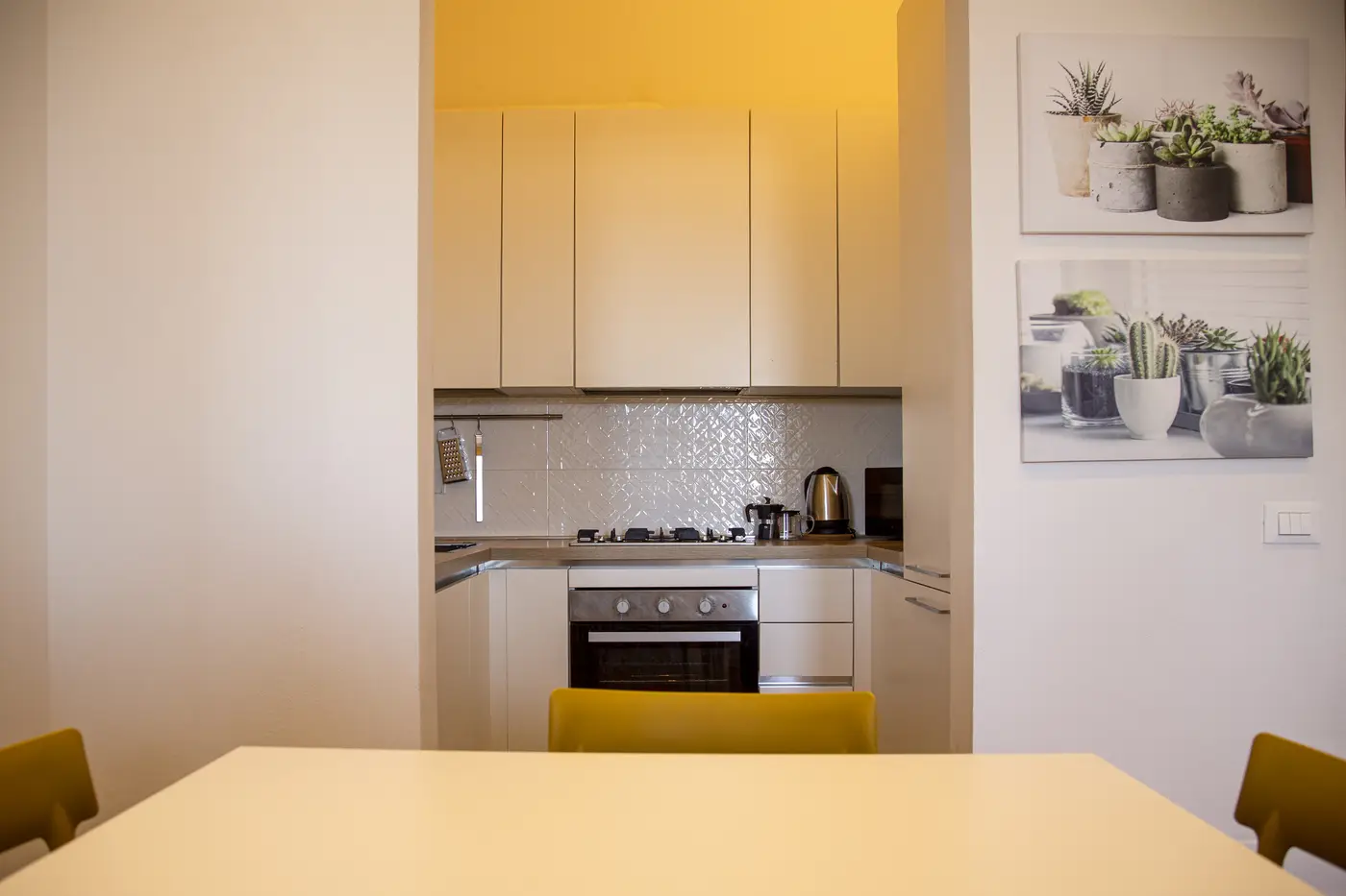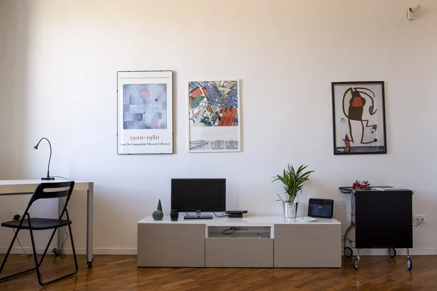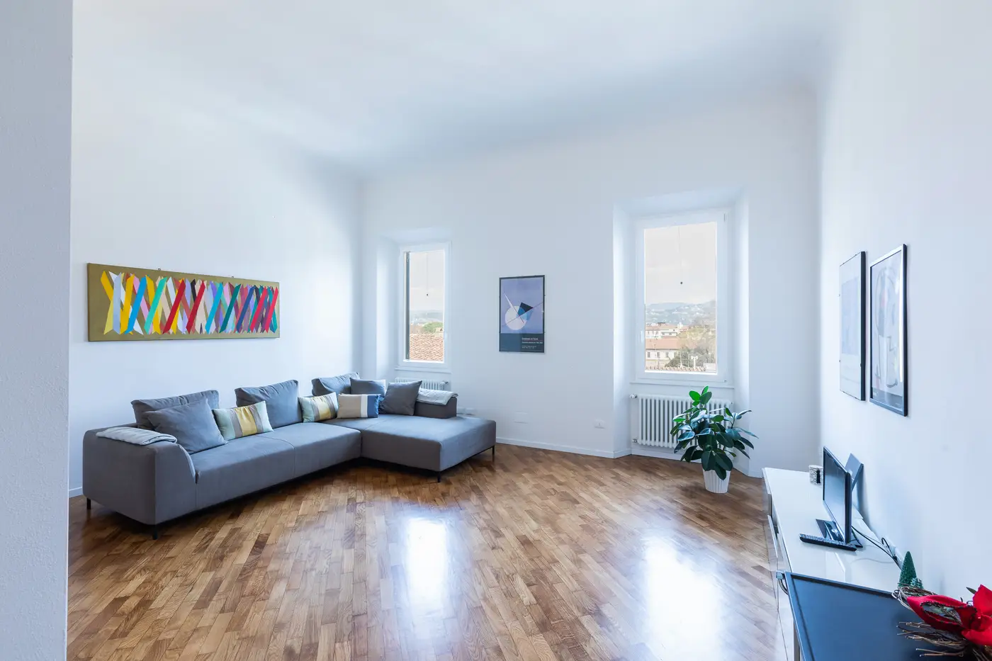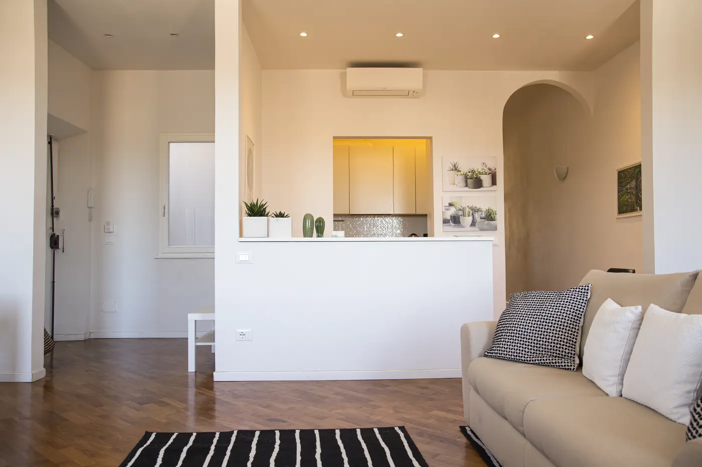 Luminoso appartamento moderno ristrutturato con materiali di pregio, alti soffitti e pavimenti in parquet, situato al quarto piano (senza ascensore). L’appartamento può ospitare comodamente famiglie o gruppi ed è composto da: