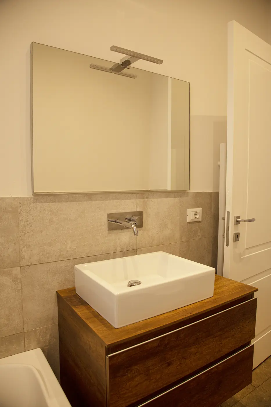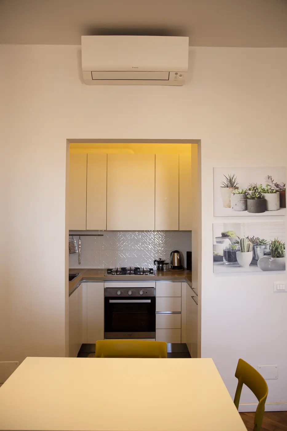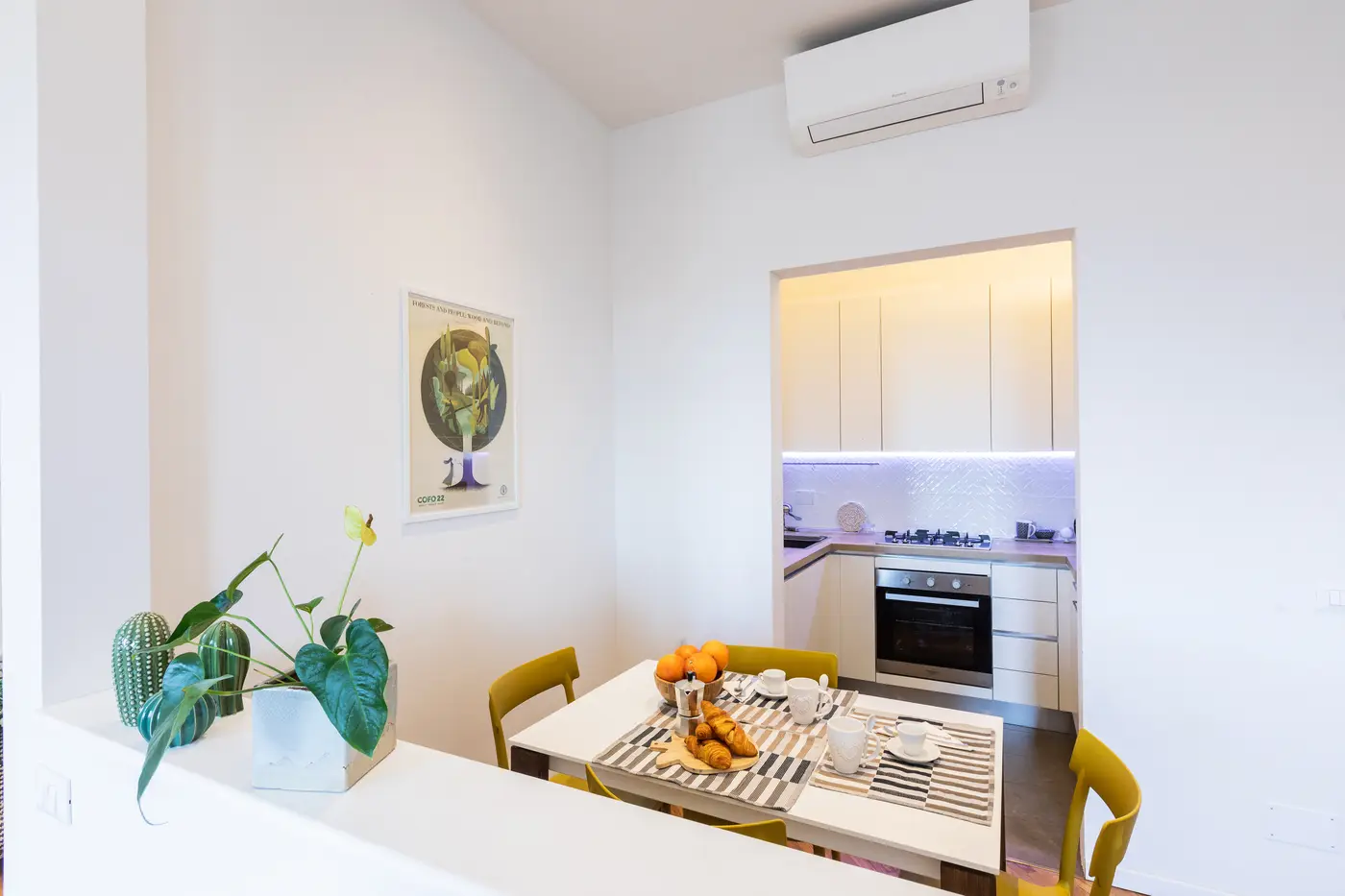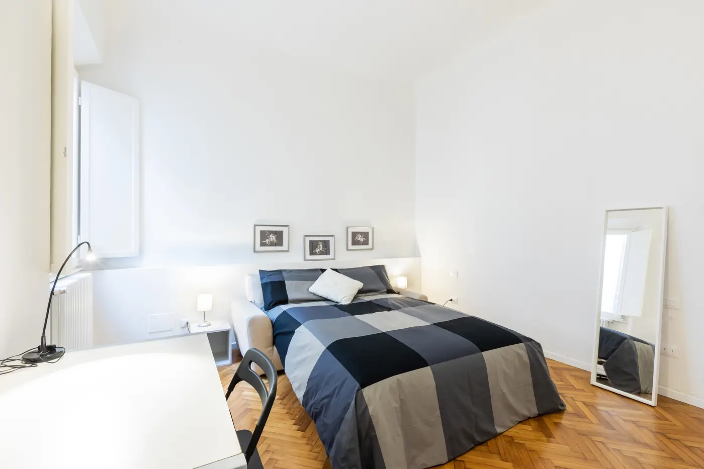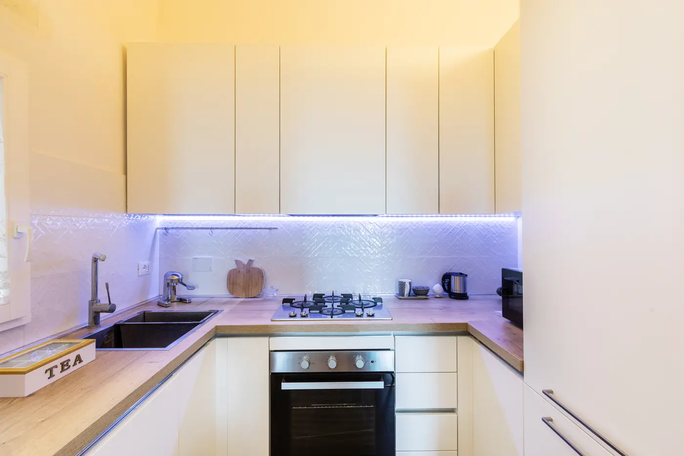 Luminoso appartamento moderno ristrutturato con materiali di pregio, alti soffitti e pavimenti in parquet, situato al quarto piano (senza ascensore). L’appartamento può ospitare comodamente famiglie o gruppi ed è composto da: