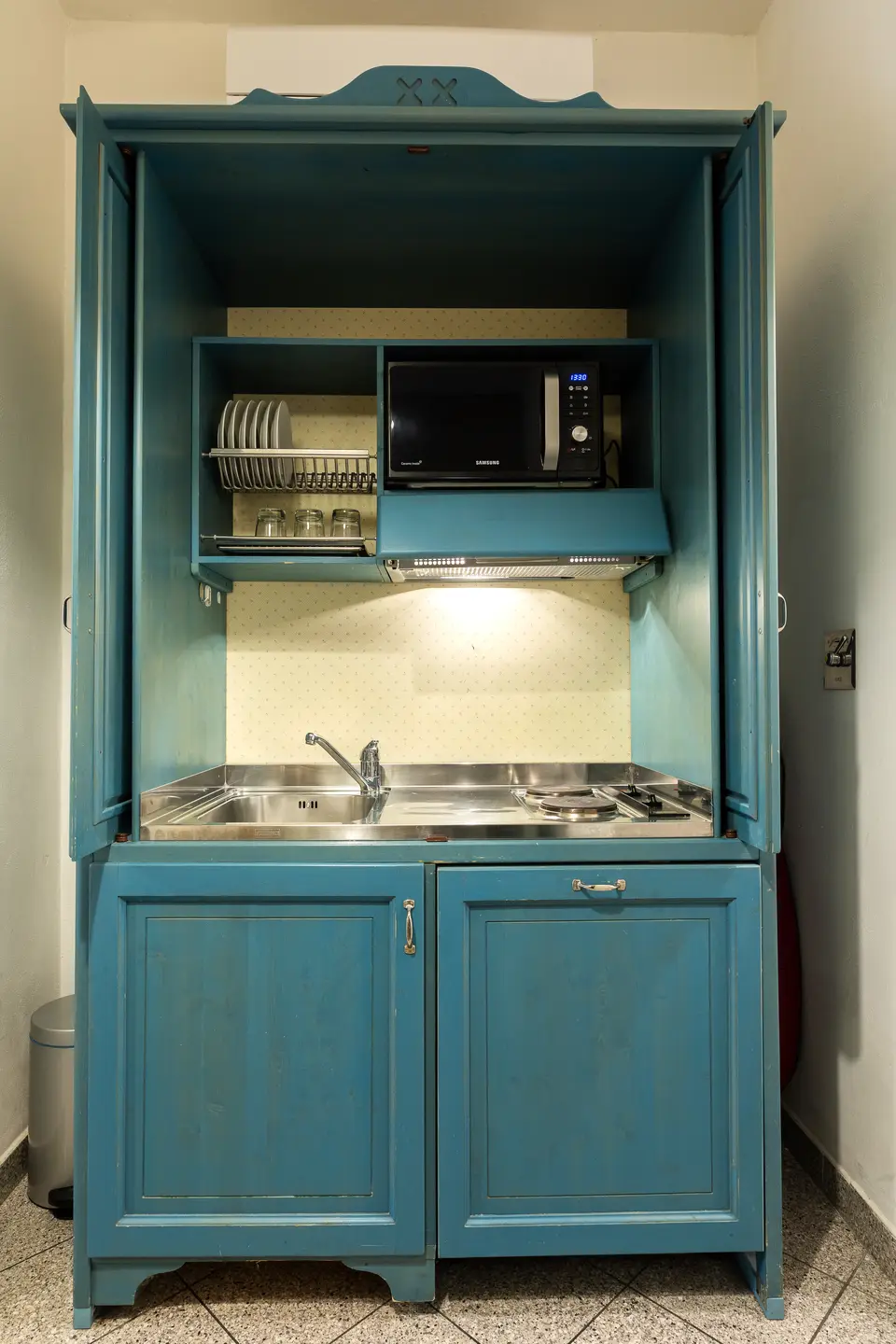 - Cucina a scomparsa funzionale, completa di stoviglie ed elettrodomestici