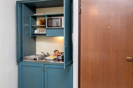 - Cucina a scomparsa completa di stoviglie ed elettrodomestici