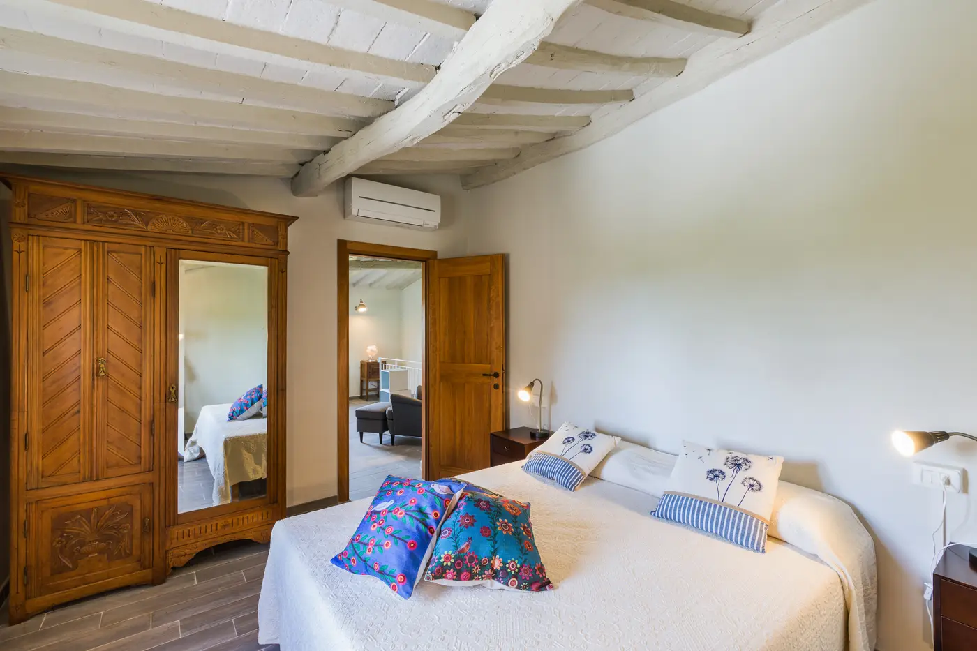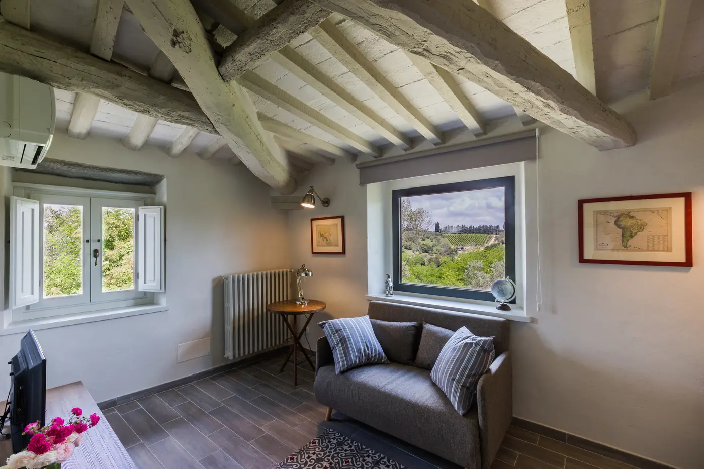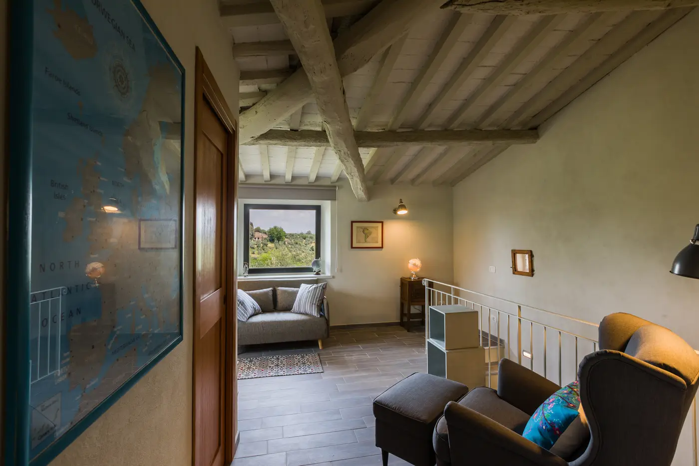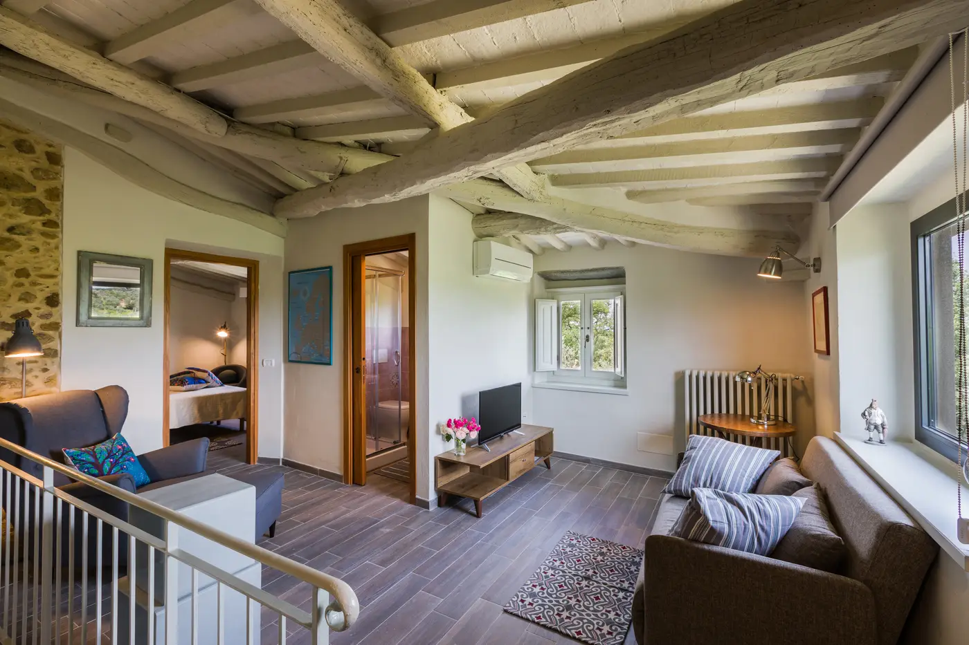 - Primo piano: salotto con vista sulle colline toscane, camera matrimoniale, bagno con doccia